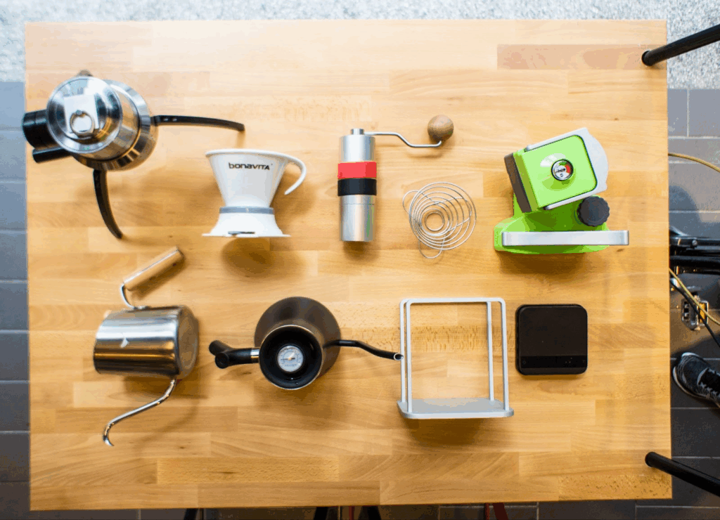 蔡治宇表示,除了咖啡飲品、熟豆外,身為資深玩家的他當然在店內也擺放了不少器材商品使用及販售。蔡治宇本身對於有特色、好用、手工感的東西特別感興趣,而店內展售的器具也一定是經由他嘗試後並認可的,才會想推薦、販售給客人。其中最受歡迎的是海勒磨豆機和Acaia磅秤,Acaia雖然價格不斐,但一分錢一分貨,內部最重要的零件據說使用相當於工業秤等級,且故障率極低,販售至今從沒遇過有人拿回來要維修。海勒磨豆機則是達文西咖啡的獨家商品,不論是刀盤、外觀設計、咖啡呈現的風味等表現都非常好,所有手搖磨豆機該有的優點幾乎都有了。