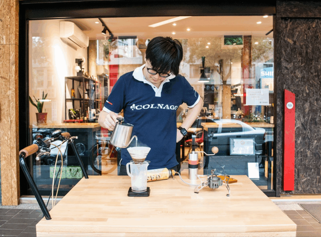 蔡治宇表示,自行車業曾有一番榮景,但是,有大起也會有大落,後來自行車市場開始變得有些混亂──上游跟下游、廠商彼此間非良性的不對等關係,以及消費者對於專業該給予的尊重仍然不足,最後導致有些失控。於是他毅然決然地收掉自行車事業,重新裝潢並將店面經營型態轉型──店內可看到桌子是由三台腳踏車所組合而成的,平時當作吧台桌使用,有活動時便可作為行動腳踏車攤。目前蔡治宇經營全方位的咖啡事業,從負責店內烘豆到擔任咖啡課程師、咖啡賽事評審等全都包辦,而店內吧台手兼行銷業務則由弟弟蔡治洋負責。