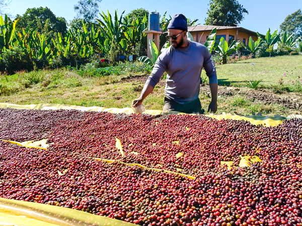 2025年1月2日清晨,我們沿A8省道南行,歷時約一個半小時,抵達DW咖啡出口公司位於布谷.阿貝村的日曬場。公司大老闆德米希與出口部經理阿萊格親自迎接。場區海拔2,200公尺,陽光強烈,駐場經理介紹:「這裡共有百餘張日曬床,每張容量約1,000公斤鮮果,經乾燥脫殼後,僅能產出約200公斤生豆。」