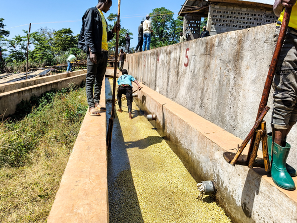 隨著強力的搓洗及水流的推送,豆子會往水道低處流去。這些熟練的技工,會在水道末段插上一塊高約15公分的矮木壩,阻攔質地較重的豆子;而質地較輕浮的豆子和果皮,則會隨著水流漫過木壩,流向第二等級區。至於質地較沉重,無法越過木壩的豆子,被引流至第一等級槽。最末段的工人,兩人一組抬著層架,將剛清洗完成的豆子運送至曬床進行乾燥。這種類型的水洗站在水源較充足的地方很常見,製作效率很高,在產季的高峰期,能夠處理大量的採收鮮果,但缺點是會消秏大量的水資源,並產生很多的廢水,對下游造成水污染問題。