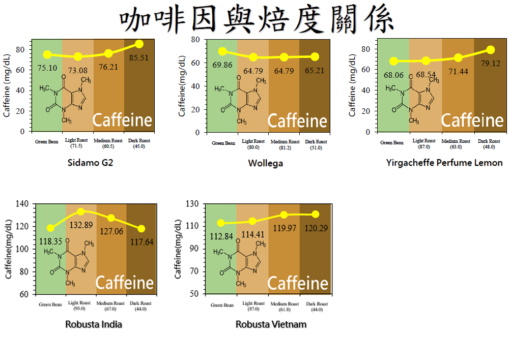 至於咖啡因,則顯現出另一番趣味的實驗結果。分析結果顯示,咖啡因含量與焙度間並無明確的關聯性。圖中Yirgacheffe Perfume Lemon豆在不同焙度的咖啡因含量從68.06 mg/dL增至79.12mg/dL,而Robusta India則由132.89mg/dL降至117.64 mg/dL。這說明真正影響咖啡因濃度的,其實除了豆種本身所攜帶的咖啡因之外,另外也可能受到咖啡研磨的顆粒尺寸與萃取的影響,烘焙的深淺並不是導致咖啡因濃度變高的主因。