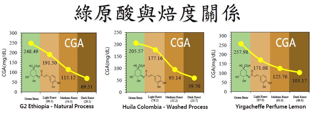 以綠原酸(CGA)為例,這是咖啡豆中最主要的多酚類物質,也是酸味的主要來源之一。在Lighttells-CA700的科學實測中,來自衣索比亞的精選豆,生豆含有高達248.49mg/dL的綠原酸。隨著焙度的加深,其濃度依序下降,淺焙:191.50mg/dL、中焙:115.12mg/dL、深焙僅剩69.51mg/dL,精確地印證了「酸味隨烘焙升高而降低」的經驗之談。