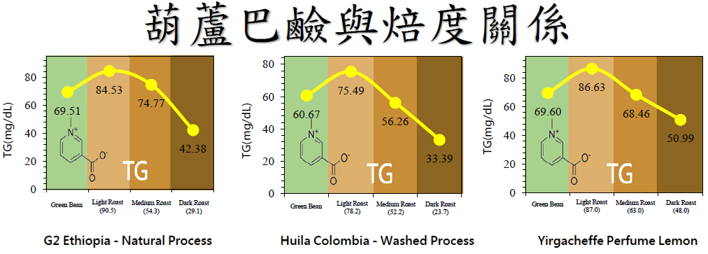 咖啡風味的另一個關鍵來自葫蘆巴鹼(Trigonelline)。這種天然生物鹼在高溫烘焙時會分解成菸鹼酸(Niacin)與吡啶類化合物(如Methylpyridine)。這些化合物與梅納反應和焦糖化共同作用,為咖啡帶來堅果、焦糖及烘焙香氣的部分來源。以Huila Colombia豆為例,分析結果顯示,淺焙階段葫蘆巴鹼含量為75.49mg/dL,至深焙時葫蘆巴鹼降為33.39mg/dL,數據顯示出烘焙過程中此項生物鹼的分解軌跡,也讓我們理解香氣化合物的轉變,並說明不同焙度為何呈現截然不同的風味表現。