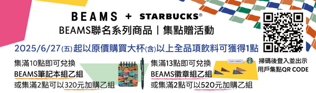 想要更時尚的造型,選購該系列的顧客可享專屬聯名贈品,例如附有筆的BEAMS筆記本組以及BEAMS徽章組可收藏。6月24日起購買任一BEAMS聯名商品即可以320元加購BEAMS筆記本組或520元加購BEAMS徽章組。6月27日起原價購買大杯(含)以上全品項飲料可獲得1點,集滿10點即可兌換BEAMS筆記本組乙組,集滿13點即可兌換BEAMS徽章組乙組,或集滿2點可以320元加購BEAMS筆記本組乙組或520元加購BEAMS徽章組乙組。
